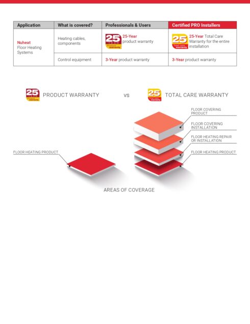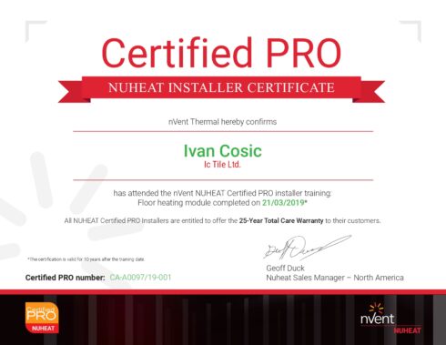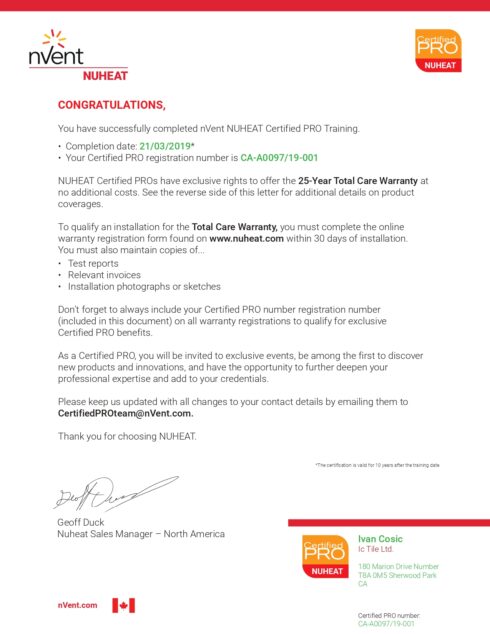 We are the NUHEAT® Contractor in Edmonton, and NUHEAT® is the leading manufacturer in Canada for heated floors. NUHEAT® heating mats are easy to install under tile, stone, and wood flooring. Tiling can be done after the NUHEAT® mat is thinsetted to the subfloor for immediate tile heating. We can install electric, or a hydronic system using circulating water, in wet places such as showers, saunas, and steam rooms in homes or commercial buildings. Mildew growth is unlikely with heated areas that dry out quickly. As a heated tiling contractor, we are certified PRO installers to put in your NUHEAT® system and when we install the heating wires, you get a 25-year Total Care Warranty for installations on all nVent NUHEAT® floor heating products to cover product defects along with a 3-year Warranty on all nVent NUHEAT® thermostats. This includes the same coverage of the NUHEAT® 25-year product Warranty in addition to repair or replacement of an underfloor heating system, floor covering, and installation costs.